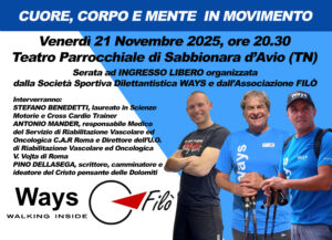 Venerdì 21 novembre 2025, il teatro parrocchiale di Sabbionara d’Avio (TN) si è riempito di attenzione, motivazione ed energia per la serata “Cuore, Corpo e Mente in movimento”, un evento nato dalla collaborazione tra la società sportiva dilettantistica WAYS e l’associazione FILÒ.