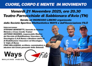 Avremo anche la possibilità di ascoltare Pino Dellasega che ci racconterà delle sue esperienze sportive, della creatività che nasce dal camminare e di come un fisico allenato sia stato un potente alleato nel superare l’ostacolo di una malattia improvvisa.